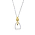 Equestrian-style, two-tone stirrup necklace with 18” chain and lobster claw clasp. Pendant is 1 ¼” long. Rhodium-plated so it retains it shine and never needs polishing. Gift boxed