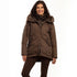 This Jacket will keep you warm on the coolest of days with a heavy weight Down fill and a layered Down Vest inside. Slight A line Shape and longer in back for a flattering shape. Long Side vent zippers so you can unzip while riding or sitting. Double entry pockets in front with leather tabs. Hood with leather drawcord detail. 2 Way Zipper in front.